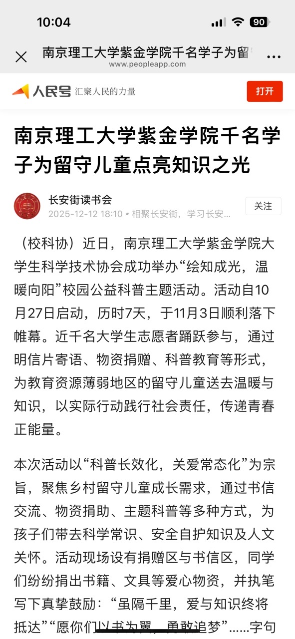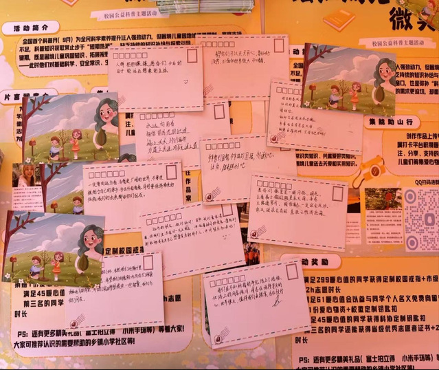 近日,我校大学生科学技术协会在团委指导下成功举办“绘知成光,温暖向阳”校园公益科普主题活动。活动自10月27日启动,历时7天,于11月3日顺利落下帷幕。近千名大学生志愿者踊跃参与,通过明信片寄语、物资捐赠、科普教育等形式,为教育资源薄弱地区的留守儿童送去温暖与知识,以实际行动践行社会责任,传递青春正能量。该活动被人民日报公众号(人民号)进行宣传报导。