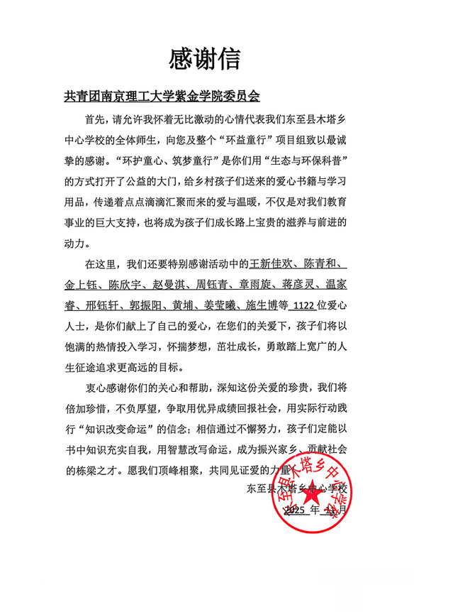 活动期间,校科协成员充分发挥组织协调与示范引领作用,积极拓展宣传渠道,吸引更多学子加入公益行列。据统计,本次活动共募集爱心书籍300册、文具756份,总计1056件物资,均已送达安徽省东至县木塔乡中心学校。木塔乡中心学校专门致来感谢信和锦旗,称赞我校活动“以生态与环保科普开启公益之门,用爱与知识滋养乡村孩子成长之路”。